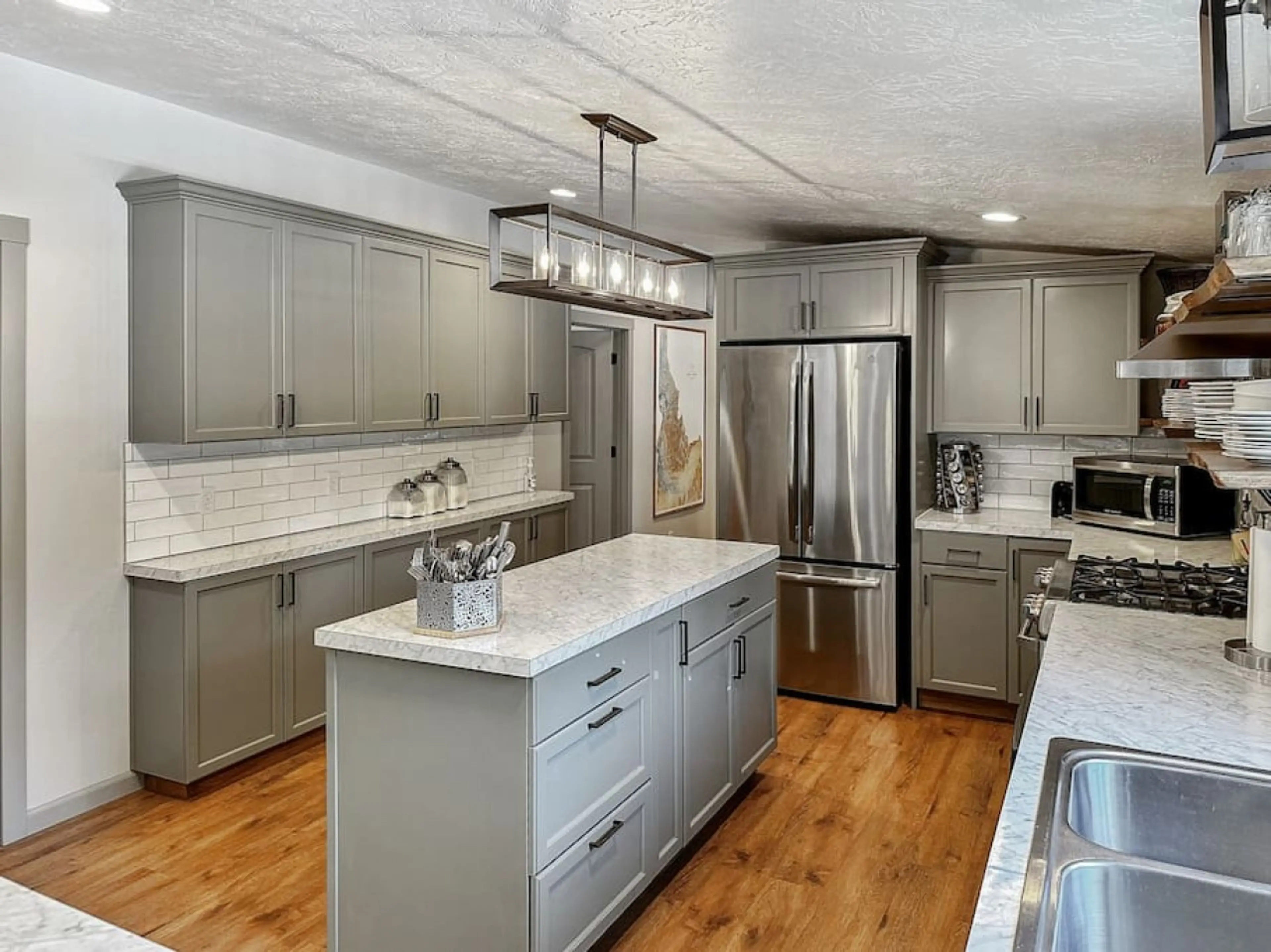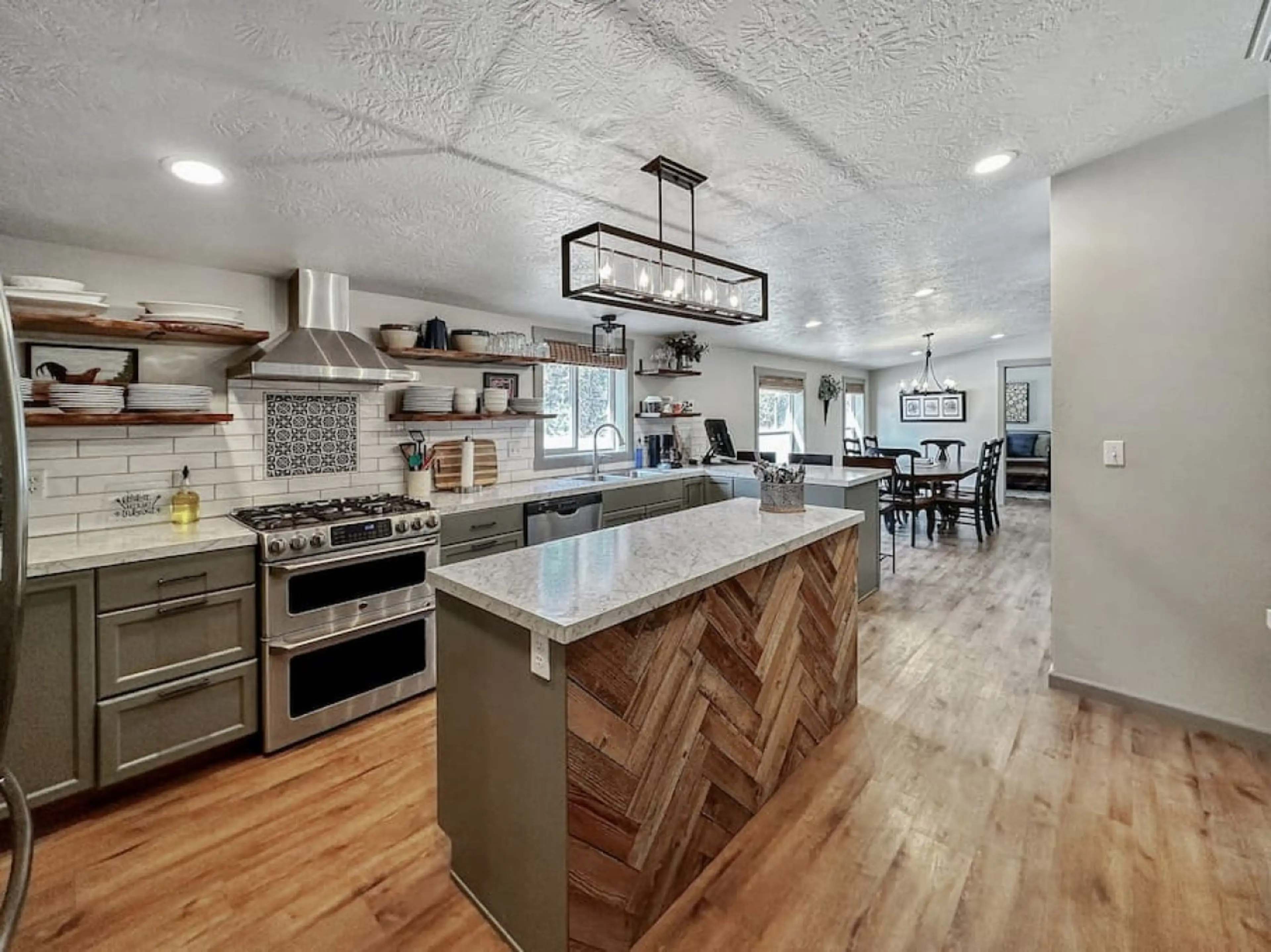 This modern cabin is located south of Cascade, near Clear Creek Station, a little over an hour north of Boise and Eagle, and close to the popular Cabarton rafting put in area on the Payette River. The spacious living room has a large sectional sofa, a cozy propane fireplace and ample windows wher...